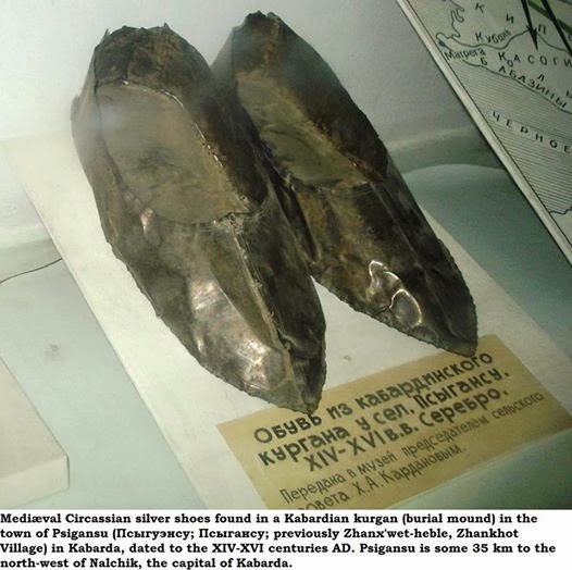 Mediæval Circassian silver shoes found in a Kabardian kurgan (burial mound) in the town of Psigansu (Псыгуэнсу; Псыгансу; previously Zhanx'wet-heble, Zhankhot Village) in Kabarda, dated to the XIV-XVI centuries AD. Psigansu is some 35 km to the north-west of Nalchik, the capital of Kabarda.